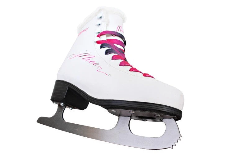 Der Damen Schlittschuhe NICE ist für Freizeit- und Fashioneislauf gedacht. Der Schuh ist aus dem syntetischem Material „PVC cool water“ und somit gegen Nässe resistent. Er ist mit feiner Struktur und modernem Druckdesign, sowie mit 6 Klitzersteinen verziert. Im Knöchelbereich befindet sich eine anatomische Schuheinlage. Die speziellen Materialien sorgen für ein gutes Wärme- und Traggefühl. Die Schlittschuhe passen sich an die individuelle Form des Fußes an. Die Fell-Imitation im Inneren sorgt für behagliche Wärme. Die Kufen sind klassisch aus rostfreiem Stahl.